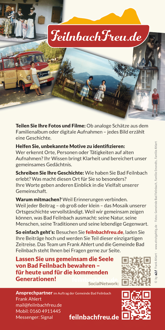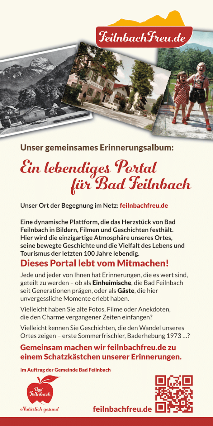 Haben Sie besondere Erinnerungen, historische Fotos oder Urlaubsmomente aus Bad Feilnbach? Dann machen Sie mit und helfen Sie, das kulturelle Gedächtnis unseres Ortes für zukünftige Generationen zu bewahren.