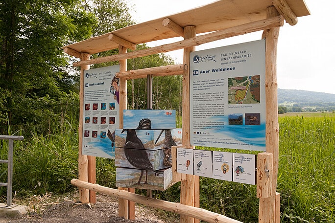 Der Spaziergang auf dem Themenweg „Wasser & Moor“ startet an der Brücke in der Nähe der Jenbachhalle in Bad Feilnbach. Mit dem Überqueren der Hauptstraße gelangt man direkt zum Themenweg. Die verschiedenen Stationen geben lehrreiche Auskünfte über die heimische Natur und den Lebensraum ansässiger Tiere. Um diese Stationen mit Leben zu füllen, sind zahlreiche Aktivitäten eingebaut, die das Thema Wasser spannend und abwechslungsreich für Kinder vermitteln. Auf halber Strecke befindet sich das Café Moosmühle, eine tolle Einkehrmöglichkeit für Kaffee, Kuchen oder einen Becher Eis. Gut gestärkt geht es wieder zurück zur Jenbachhalle.