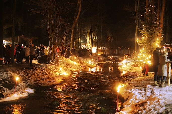Bei Einbruch der Dunkelheit wird dann deutlich, warum die Waldweihnacht in Bad Feilnbach nicht wie jeder andere Christkindlmarkt ist: Hunderte Lichter, Fackeln und Lagerfeuer tauchen den Naturpark in ein stimmungsvolles Licht und stimmen auf die bevorstehende „staade Zeit“ ein.